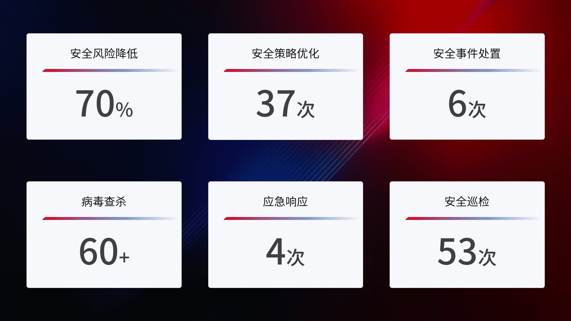 提供全面的安全事件报告体系,,包括处置报告、、周报、、、、季度和年度总结,,结合持续监控,,,帮助客户深入了解网络安全状况。。。